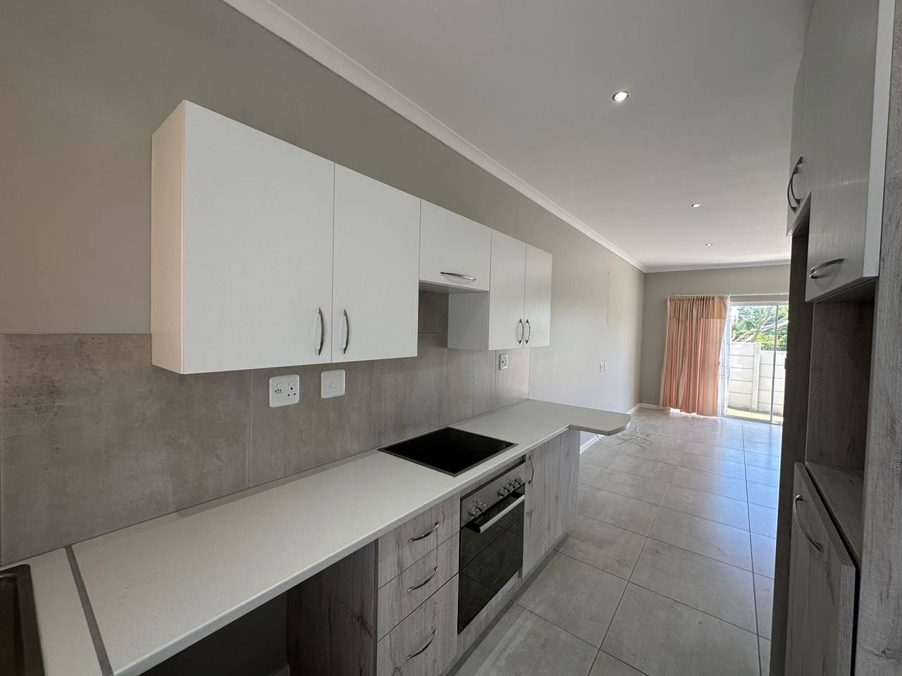 Spacious, bright and sunny, open plan lounge with a sliding door to a small garden. A well fitted kitchen with a built in oven and glass top hob and plumbing for a washing machine. The two bedrooms both have fitted cupboards. A lovely bathroom with a walk in shower, toilet, basin set in a vanity. The unit is fitted with an energy efficient solar geyzer.